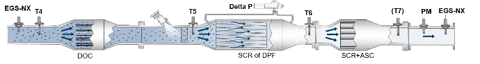 The exhaust gas flow resulting from the running of the diesel engine enters the diesel oxidation catalytic converter (DOC) and then the diesel particulate filter (DPF).